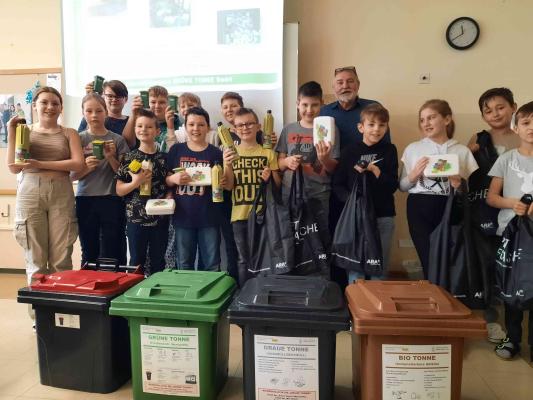 All diese Fragen beantwortete der Abfallberater des AWV Christian Pinkl sehr anschaulich für die Kinder der Mittelschule Zöbern. Zum Abschluss bekamen die Kinder noch einen Jausenbox aus Biokunststoff und eine Trinkflasche aus Glas.